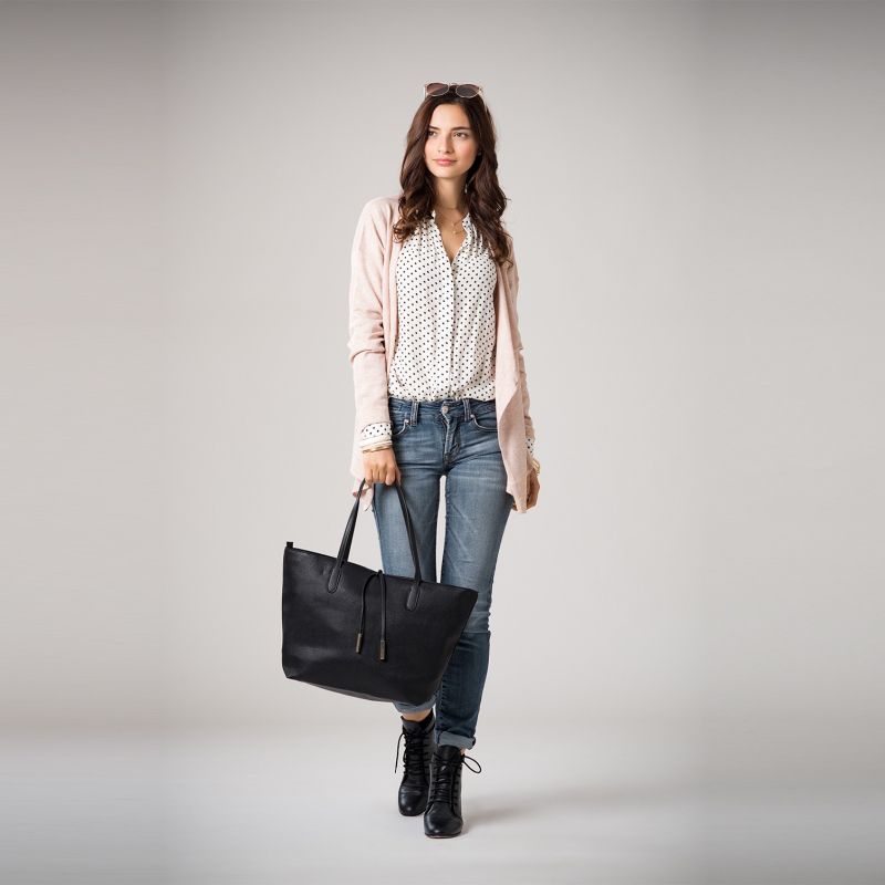 قميص كاجوال بنقشة بولكا بالأبيض والأسود، بياقة عريضة، أزرار فضفاضة، أكمام طويلة عادية، حافة منحنية