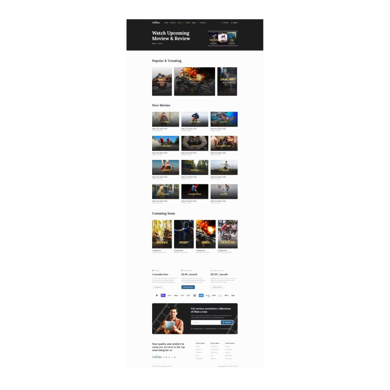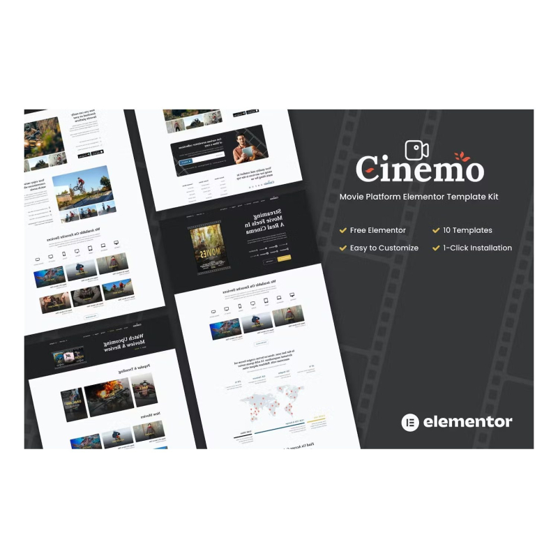 Cinemo - Video Streaming Website Elementor Template Kit is designed for video streaming agencies who want to showcase their work, services, or content. This Template Kits support responsive mobile view. This is not a WordPress theme. Template Kits contain page content for Elementor page builder. This kit has been optimized for use with the free Hello Elementor theme but may be used with most themes that support Elementor.