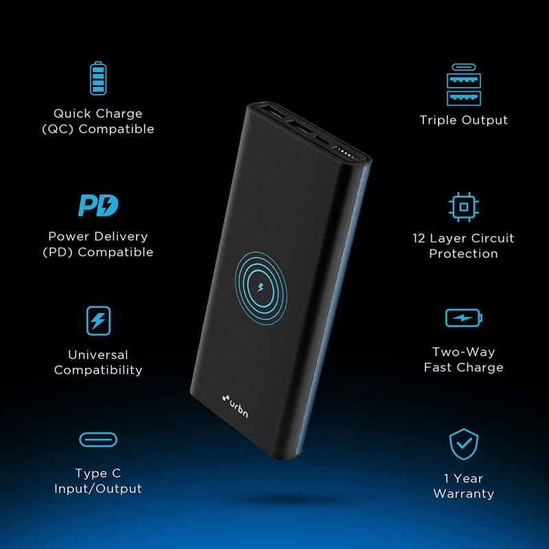 10000 mAh Wireless Power Bank with Super Fast 15W wireless charging and 22.5W wired charging charges your phone around 2 times in a flash with just one full charge.